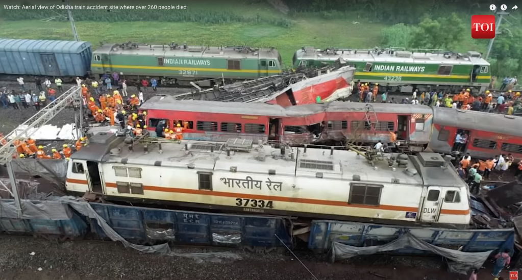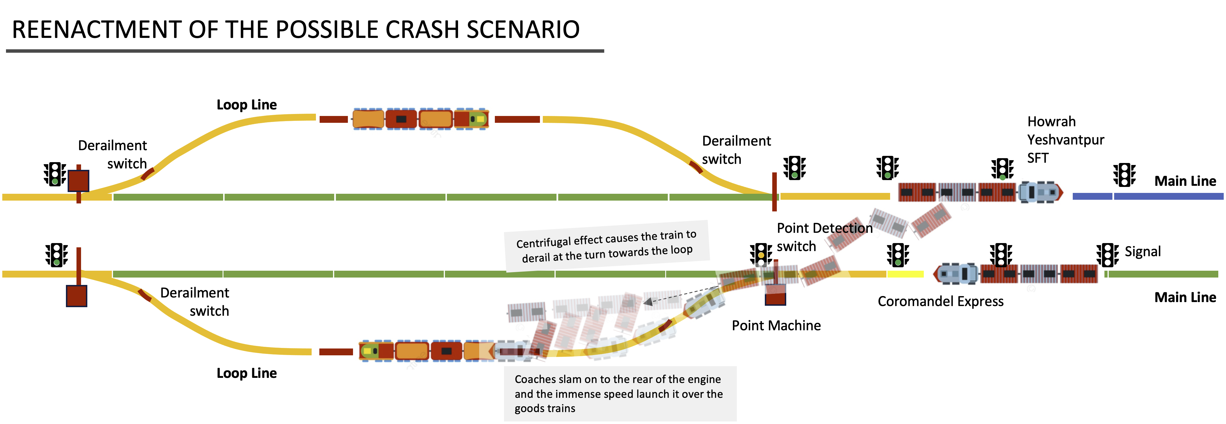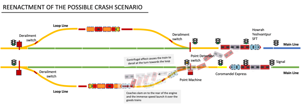 If a train did enter the loop line at Coromandel Express’ speed of 128 kph then the centrifugal effect would have caused the train to derail at the turn into the loop (similar to the Spanish train crash). The physics of this is explained in this New Yorker article. The engine would have sped towards the stationary goods train and the derailed coaches would have hurtled down in a straight line. This is why images of the wreckage above will show the coaches besides the engine as against it being behind the engine as one would expect. One of the tumbling coaches might have have crashed into the rear of the engine, the crow bar effect launched it over the goods train as against it having crashed head-on. The derailed carriages then tail whips into Howrah-Yashvantpur SFT, travelling at a relative speed of 264 kph, crashing two of its trailing carriages. What followed was one of the most tragic event in recent history, 288 dead and 900 injured, in what was to be India’s El Tren de la Muerte (train of death).