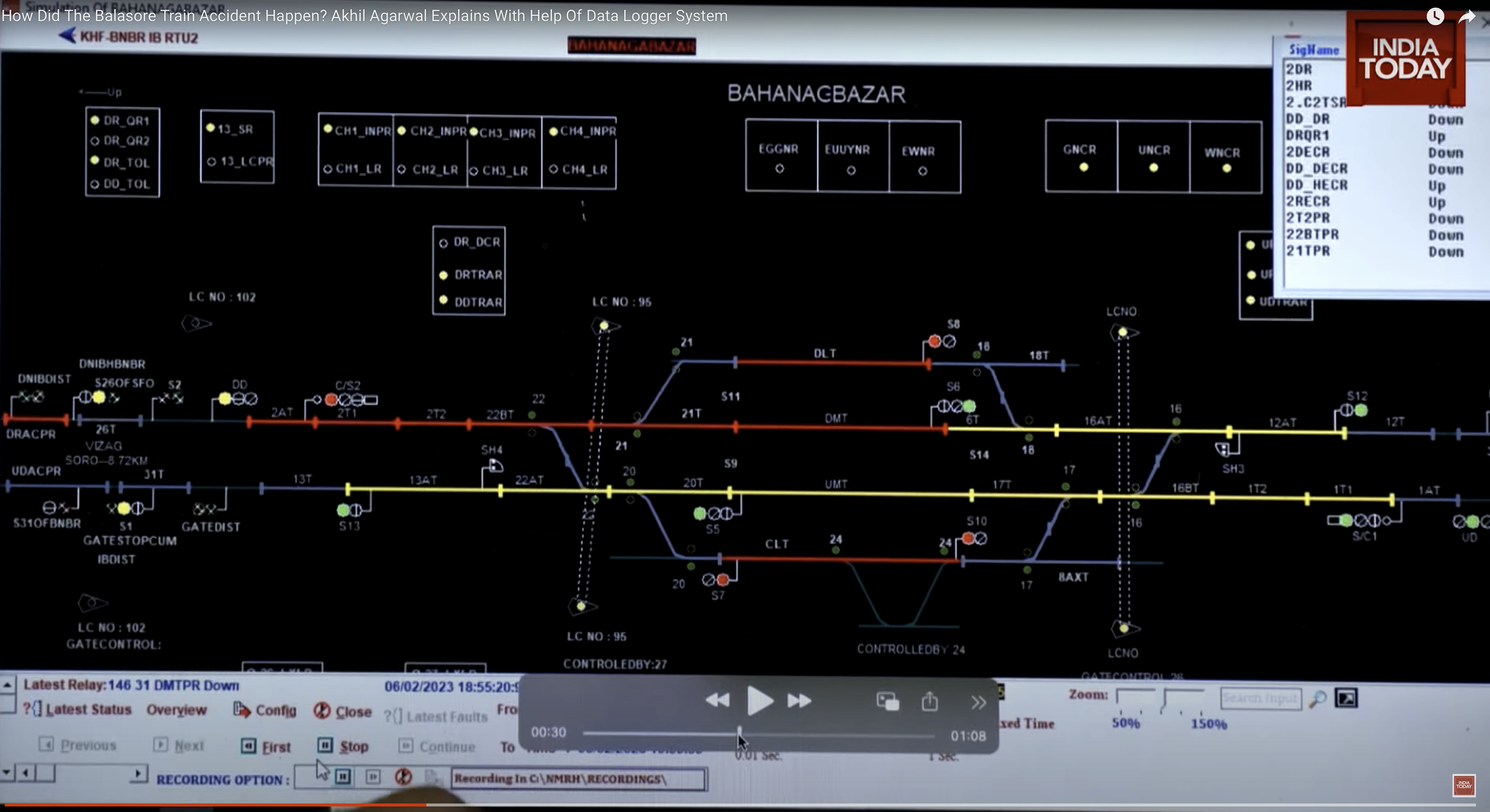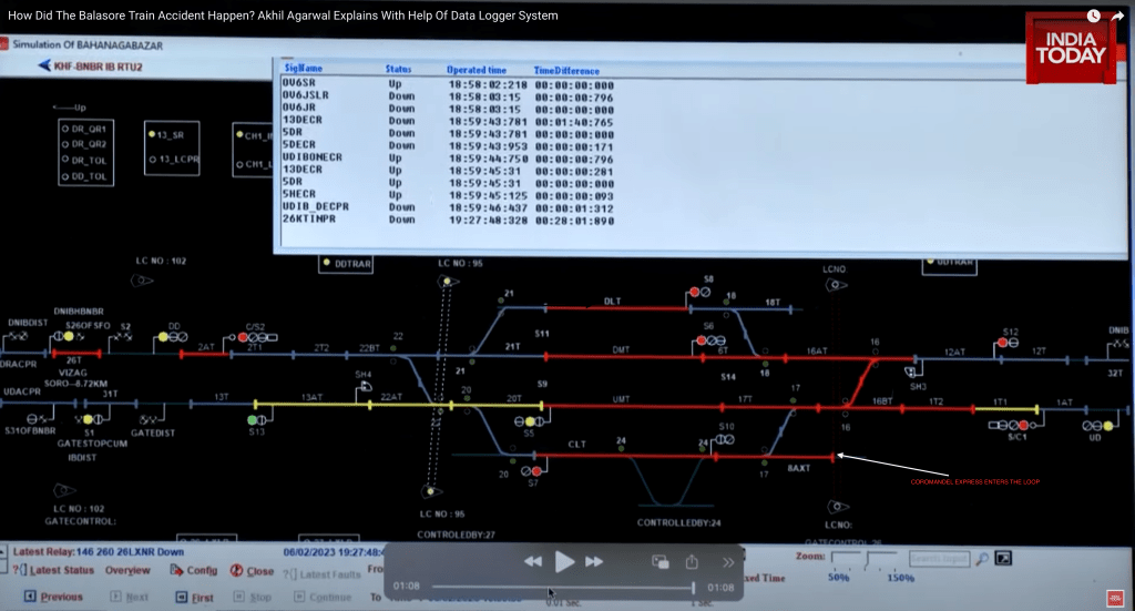 The latest evidence from the data logger is even more befuddling. The data logger is like the black box of an aeroplane, it logs the events as and when it takes place, and can be reviewed after a crash. The video showing a control panel view replayed in an India Today news report, clearly shows the routes locked and signals green for Coromandel Express to pass. It further shows the Howrah-Yashvantpur SFT passing (trains occupying track are reflected in red lines, to show the circuit is blocked for entry ). It also reflects the two goods trains birthed in their respective loop line.