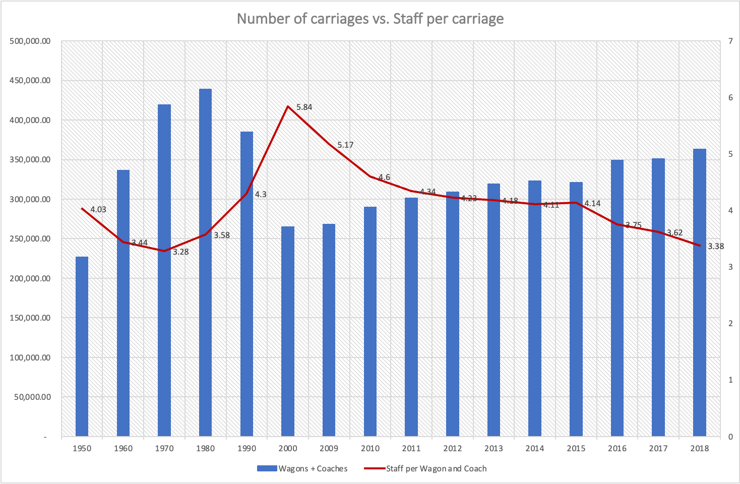 Indian railway is the largest employer in the country and has 293,000 open unfulfilled positions, that’s 25% its current strength. The Chart 2 above shows the Staff per Carriage ( total staff divided by the total number of wagons plus coaches) has reduced from 5.83 in 2000 to 3.38 in 2018, and 16% lower than what it was 73 years ago in 1950 . This is as a result of steady rise in number of carriages and reduction in gross staff capacity. To make matters worse Indian Railways has run up a significant operating loss of 15,024.58 crores or a whooping 8% of gross revenue, primarily on account of an increase in staff expenditure over the previous few years, according to a parliamentary committee.