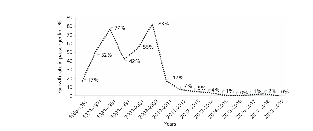 Why is this happening? Has train travel increased significantly in the last few years? Chart 1 shows at near 0% over the last 5 years, not really. There are perfectly sound reasons for why this is the case, like the rising-aspirational middle class preferring safer and faster air travel. However, getting into it would deviate from the core issue of this blog.